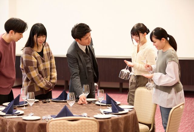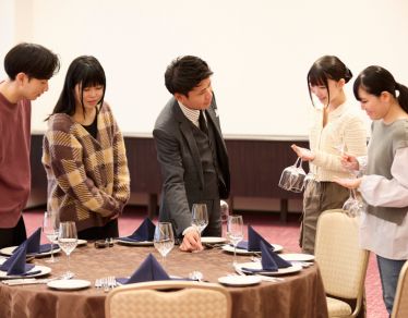 バンケット(宴会)サービスの基本を学習。婚礼、国際会議など、目的に合わせたテーブルセッティングや会場作りも学びます。