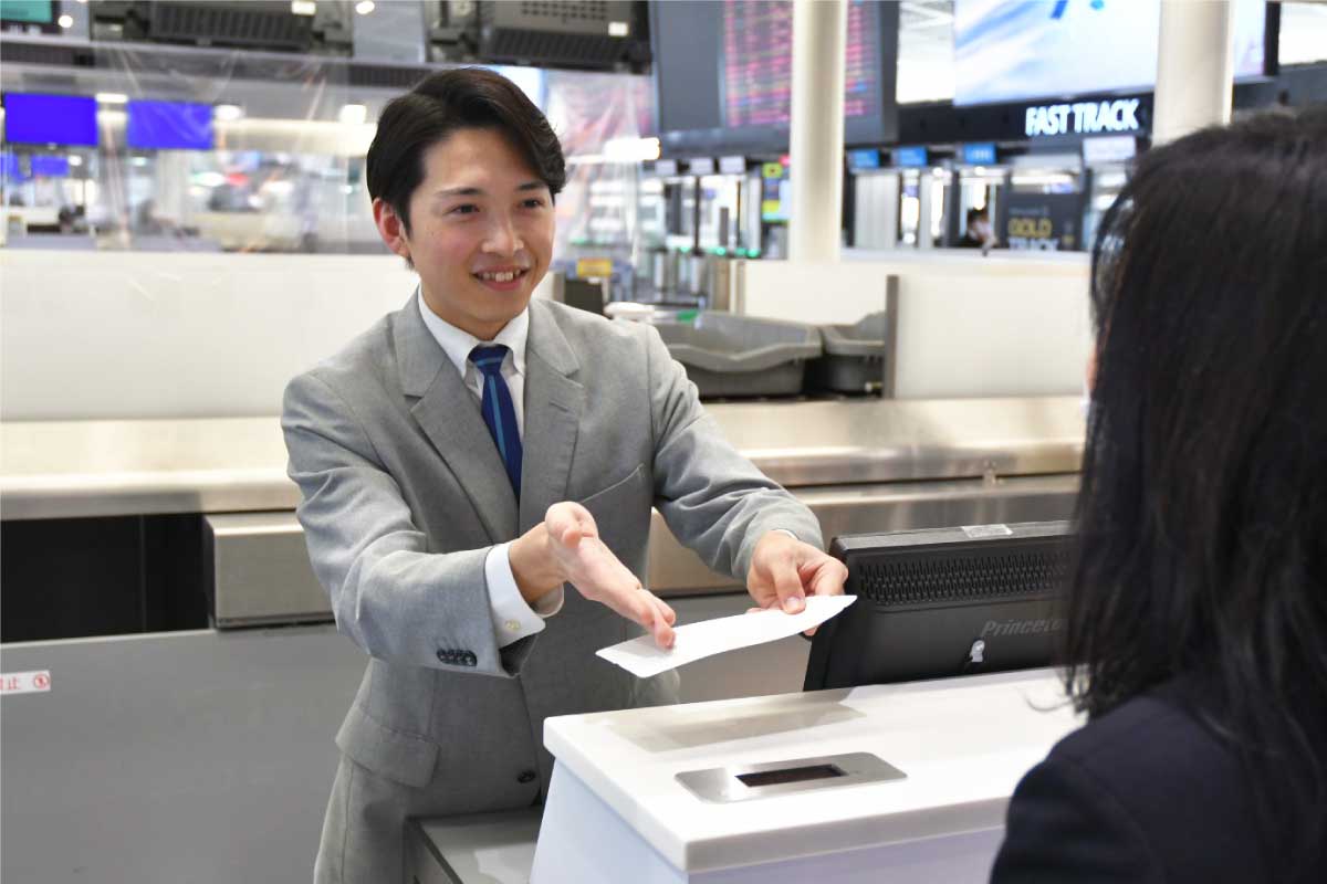 弊社が担当(受託)している海外の航空会社のチェックイン業務やゲート業務や、国際線・国内線の到着業務をおこなっています。様々な業務をおこなうので、努力なしでは務まりません。